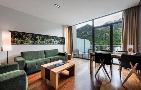 Duplex (80 м2 + 12м2, макс. 4+0 чел.) двухуровневый номер: на первом этаже - гостиная с диван-кроватью, с телевизором и большой террасой, отдельная кухня и ванная комната; на верхнем этаже - спальня с двуспальной кроватью (или 2 односпальные кровати, 100х200 см), гостевой туалет, кофемашина Nespresso, туалетные принадлежности, выбор подушек, терраса с панорамным видом на долину Валира.