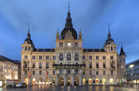 Она находится на южной стороне Главной площади, оживляемой многочисленными рыночными лотками, и является уже третьей ратушей точно на этом же месте. В центре Главной площади находится фонтан эрцгерцога Йоханна как память о „штирийском принце", основателе музея Йоаннеум, из которого вырос Технический университет.