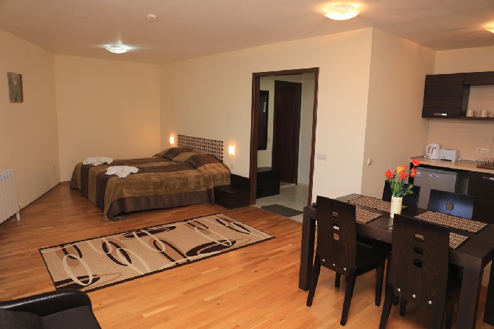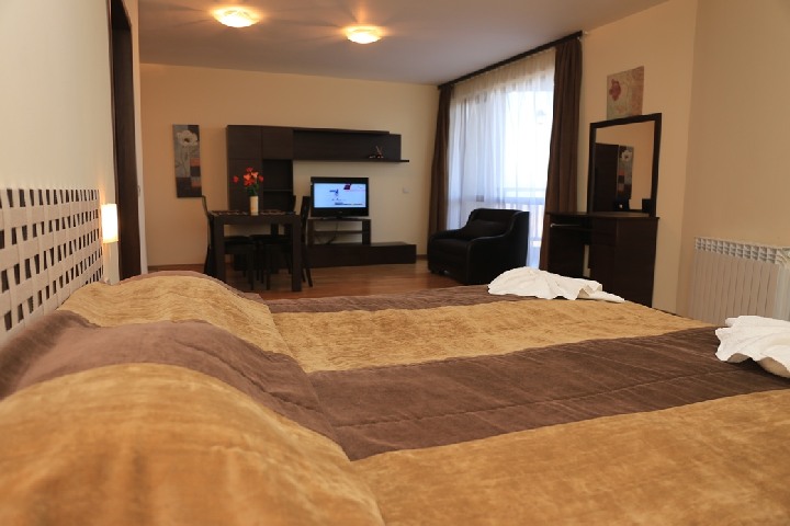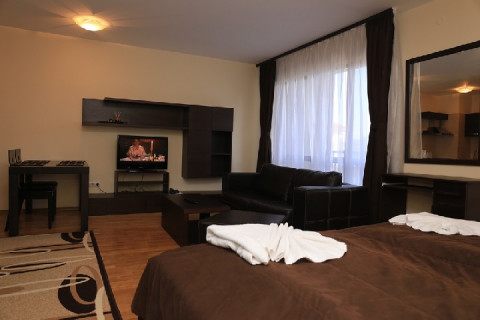 STUDIO: 2 односпальные кровати или 1 большая односпальная кровать; раскл. диван; кухонным уголком/электрический чайник, холодильник, тостер/; 1 ванная комната с душем или ванной; балкон; макс. 2в.+2р.; 35м2 ;