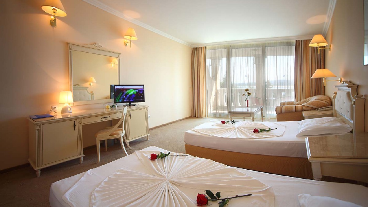 JUNIOR SUITE PV/SV: две односпальные кровати, раскл.диван; 1 ванная комната с ванной; макс.2в.+2р., 3в.+1р., 3в.; 32-36 м2.