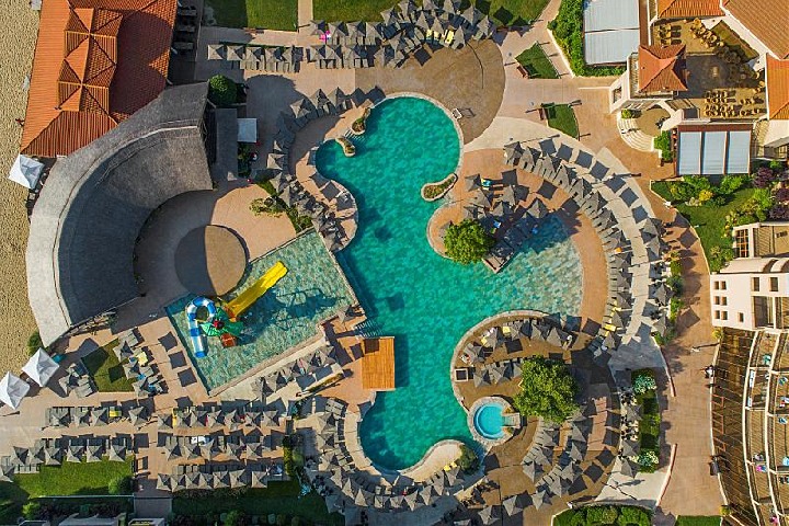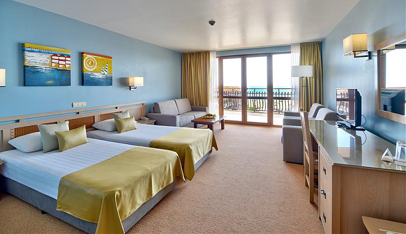 На берегу моря. 500 номеров/465 двухместных номеров, 10 студио и 25 апартаментов/