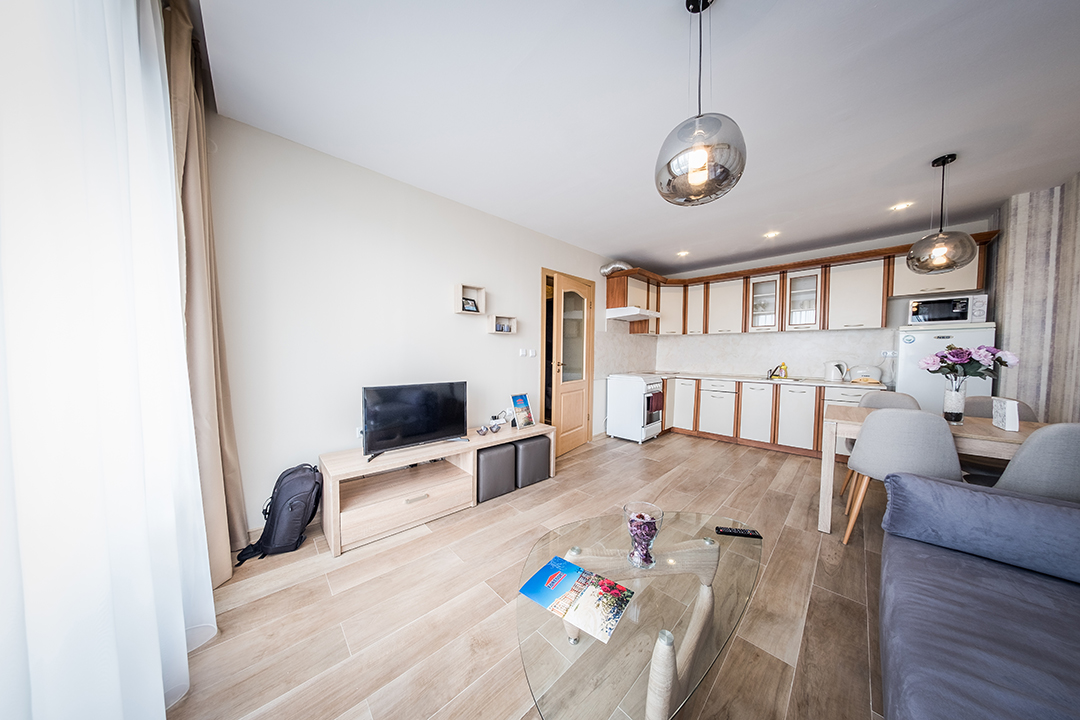1 BEDROOM APARTMENT: спальня с двуспальной кроватью; раскладной диван в гостинной; часть апартаментов имеют кухонный бокс с печью, микроволновой печью, холодильником, чайником, тостером и полным комплектом столовых приборов; ванная комната с душем; стиральная машина; макс. 2в + 2р; 3в.;