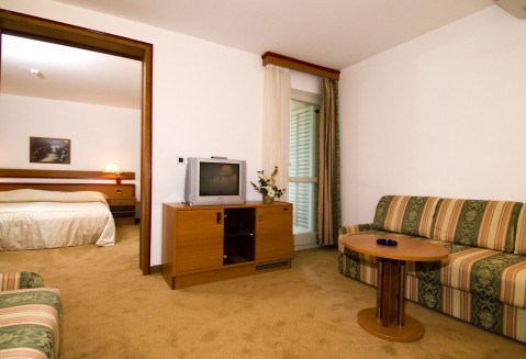 8 номеров JUNIOR SUITE Superior Balcony (40 кв.м, балкон, сторона моря, спальня с кроватями twin + гостиная с 2 диванами, соединенные раздвижной дверью, ковровое покрытие, макс. 3 чел.)