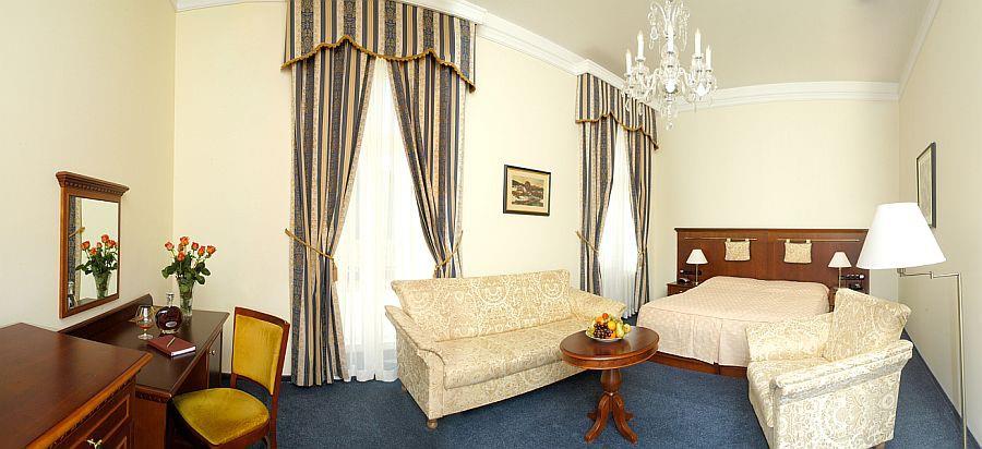 Одноместный номер Стандарт Плюс | площадь номера около 15 м2 (+ прихожая 3 м2 + ванна 4 м2 = 22 м2) | „французская“ кровать (шириной 1,40 м), стандартное оборудование и обстановка