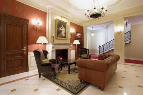 Двухместнык номер Люкс А | площадь начиная примерно с 30 м2 | номер с общей террасой и видом с торца – на парк, обстановка – мягкая мебель (2 кресла, диван) | ванная комната, оборудованная биде
