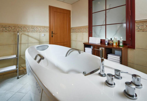 Suite (4 номера) | площадь номера 35-40 м2 | двухкомнатный номер с гостинной и спальней | макс. 3 человек (2 человека на главной постели 180 х 200 см + 1 человек на дополнительной кровати) | ванная комната с ванной, туалет, фен | балкон с видом на город | бутылка минеральной воды (на особу) по приезду в подарок | халат и тапочки - бесплатно | кофеварка Espresso + набор для кофе и чая | сауна от 9:00 до 21:00 бесплатно