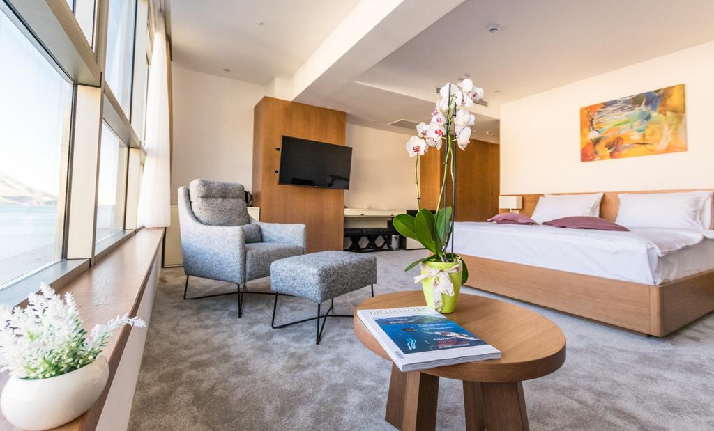 В DBL Superior BALCONY SV: французская кровать, зона отдыха, кондиционер, спутниковое ТВ, Wi Fi интернет, мини бар, телефон, сейф, чайник, санузел с душевой кабиной, фен, халаты, тапочки, балкон c видом на море. Максимальное размещение: 2 чел. Площадь: 26 м2.