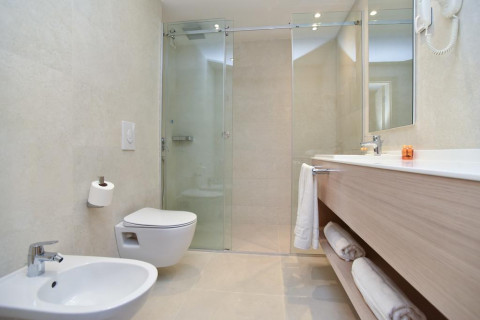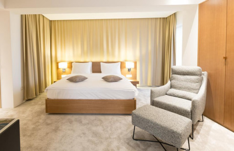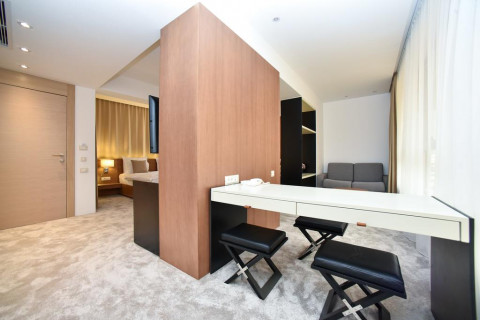 В JUNIOR SUITE: зонированный номер. В спальной зоне французская кровать, в гостиной зоне софа, кондиционер, спутниковое ТВ, Wi Fi интернет, мини бар, телефон, сейф, чайник, санузел с душевой кабиной, фен, халаты, тапочки, без балкона. Максимальное размещение: 4 чел. Площадь: 40 м2.