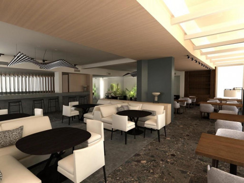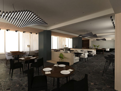 Стойка рецепции, аперитив бар, главный ресторан, конференц зал, панорамные лифты.