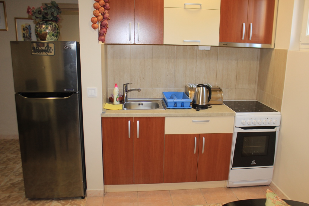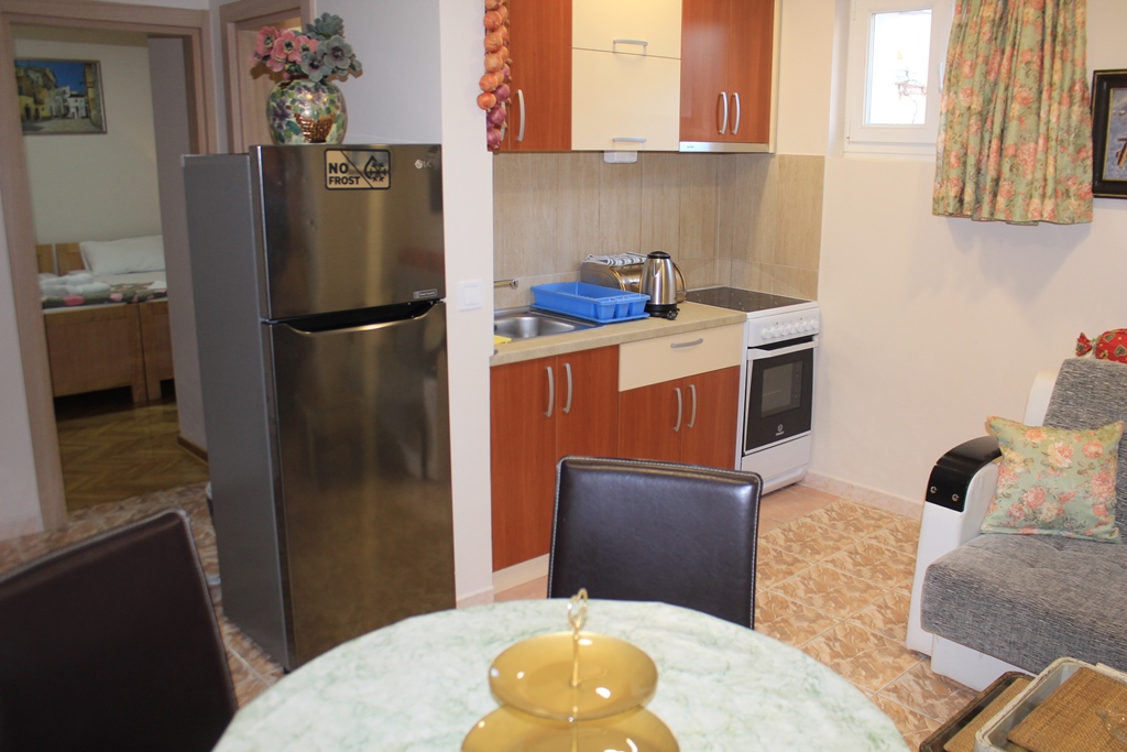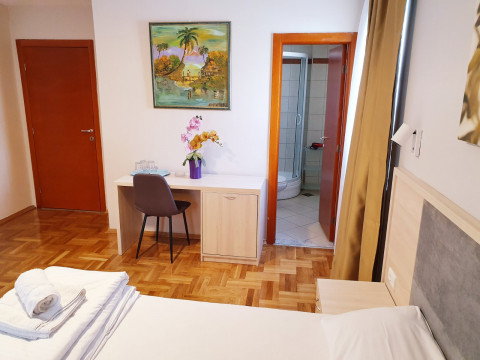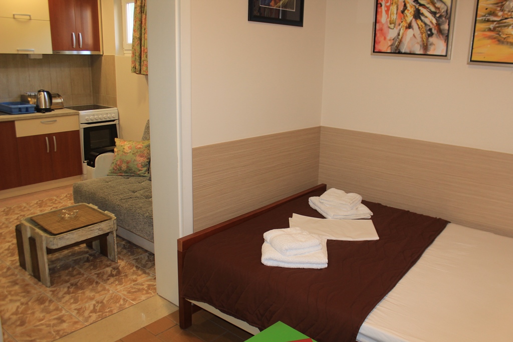 В 150м от песчано-галечного пляжа Словенска Плажа (лежак – 3 евро, зонтик – 3 евро), в 300м от мелко-галечного пляжа Могрен (комплект 2 лежака и зонтик – 15 евро).