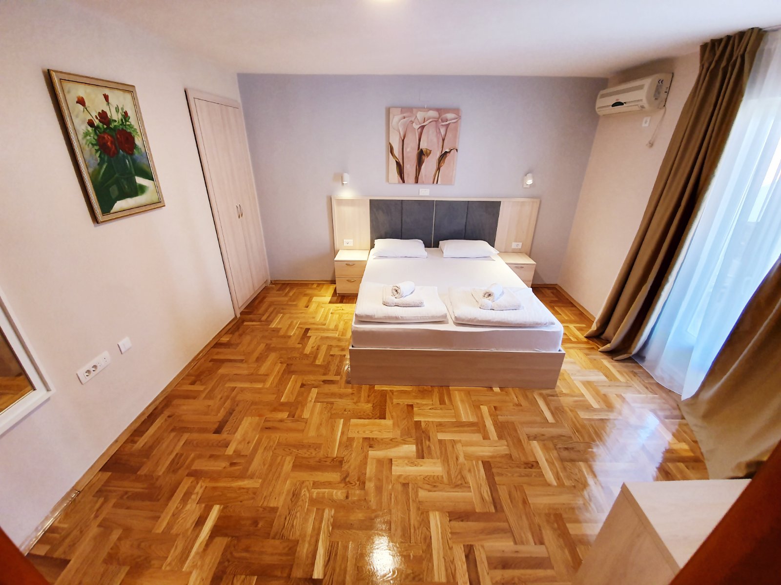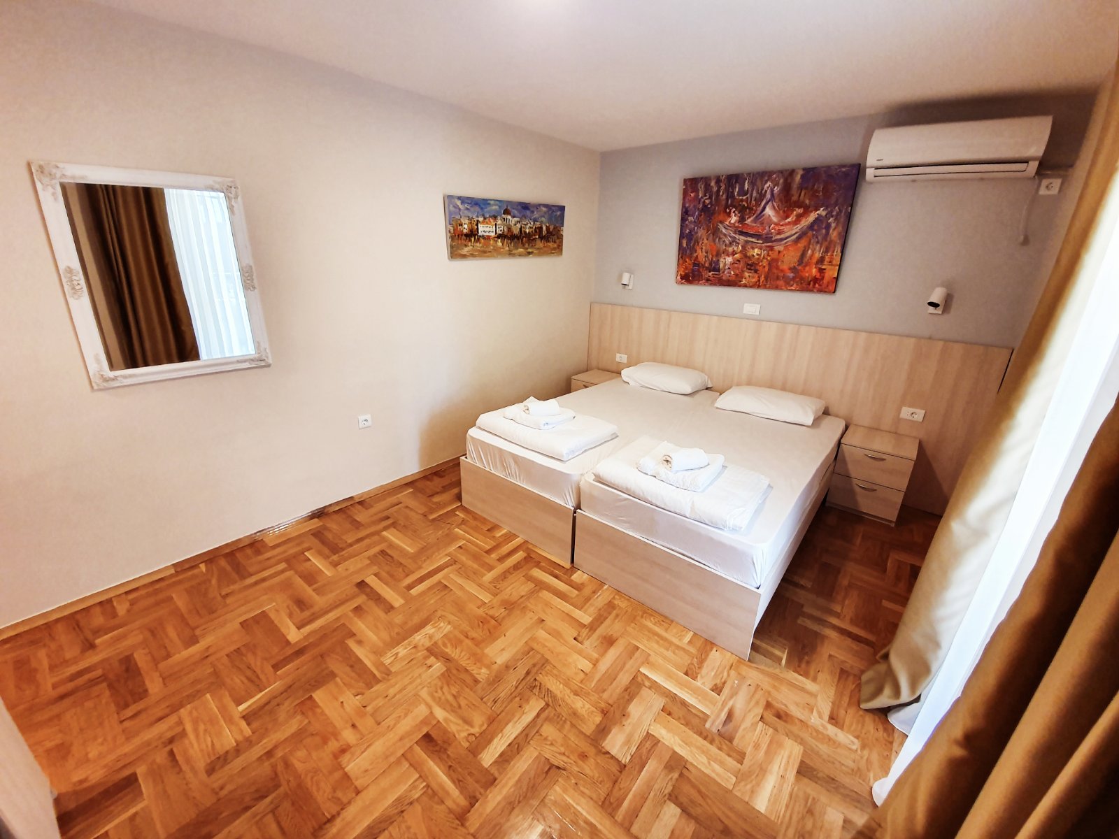 В APP: Реновация 2019 годl!!! Апартамент находится на втором этаже, трехкомнатный. 2 отдельные спальни с французской и раздельными кроватями, в каждой спальне - балкон и гостиная. В гостиной - диван, обеденный стол, кухня, чайник, холодильник, кондиционер, телевизор, интернет, сейф. В ванной комнате - душевая.