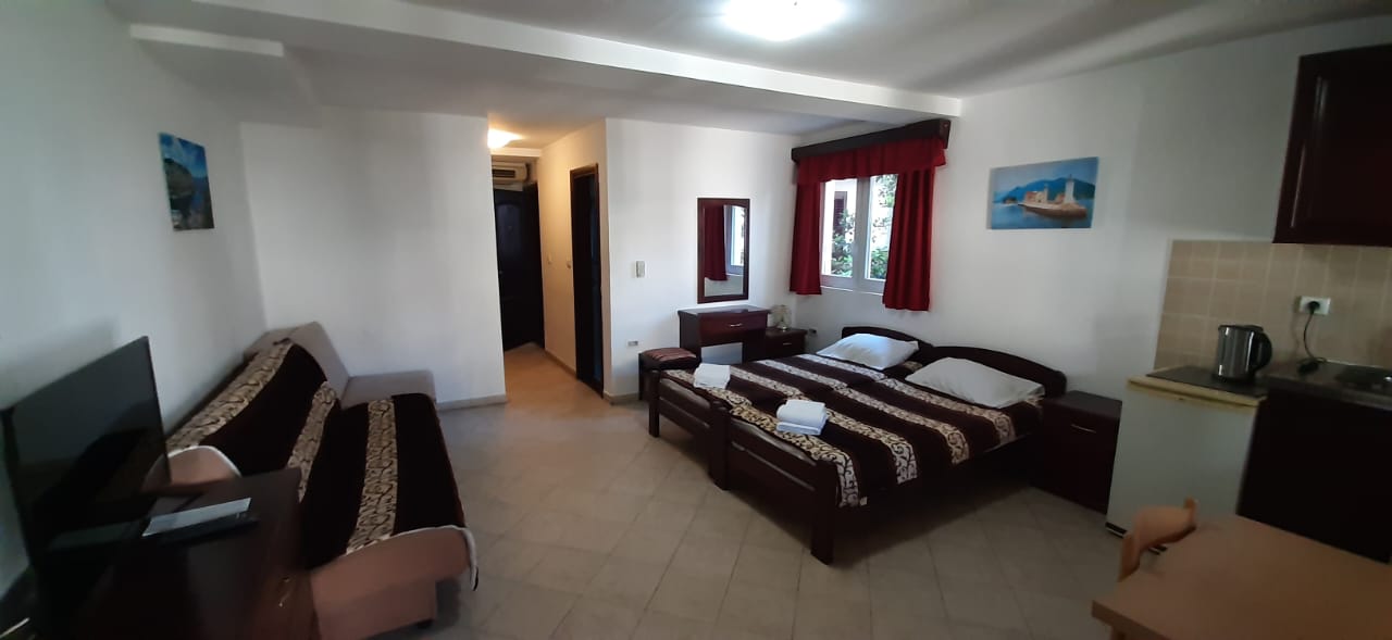 STUDIO 02 однокімнатний номер, два окремі ліжка, повноцінна кухня, вихід на балкон (стіл, стільці), у ванній кімнаті ванна/душ, фен. Максимальне розміщення 2 дорослих.