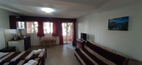 STUDIO 03+1 - просторий номер, два окремі ліжка та диван, крісло, повноцінна кухня і вихід на великий балкон (стіл, стільці), у ванній кімнаті душ/ванна, фен. Два номери, максимальне розміщення 4 особи.