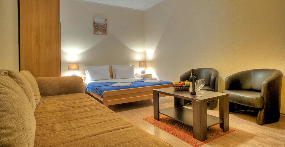B APP FAMILY: двухкомнатный номер расчитан на 4 человека. В спальне - французская кровать, в гостиной - диван, кресло, журнальный столик, кухня, необходимая посуда, холодильник, кондиционер, телевизор, балкон.