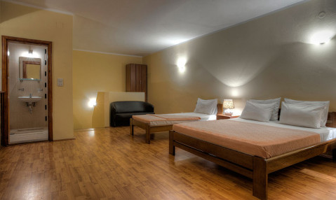 B STUDIO SUPERIOR 03: просторный номер расчитан на 3 человека, с выделенной спальной зоной. Французская кровать, дополнительная кровать, кресло, журнальный столик, кухня, необходимая посуда, холодильник, кондиционер, телевизор, балкон.