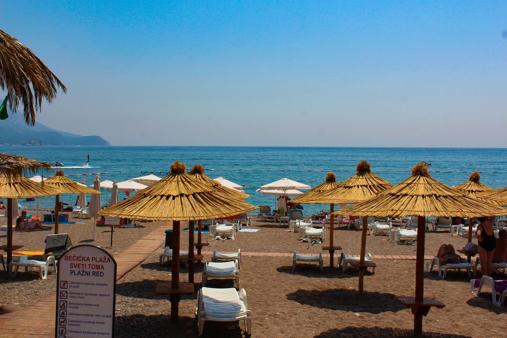 Бечичи, расположившийся всего в трёх километрах от Будвы, гордится отличным мелкогалечным, вперемешку, с песком пляжем длинной более двух километров. Пляж окружён красивыми территориями отелей с роскошными парками, благоухающими ароматами субтропических деревьев и ярких цветов. Большинство территории пляжей принадлежит отелям расположенным неподалёку, поэтому зонтики и лежаки для отдыхающих в них туристов бесплатные, а вот если вы проживаете в апартаментах, то за комплект придётся выложить 5 евро в день. А можно совершенно бесплатно воспользоваться своей циновкой. Правда в пик сезона, в июли и августе трудно будет найти место куда её порложить.