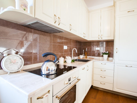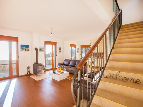 1 этаж: гостиная с раскладывающимся диваном, полностью оборудованная кухня, камин, терраса с видом на море и бассейн, санузел с душевой кабиной