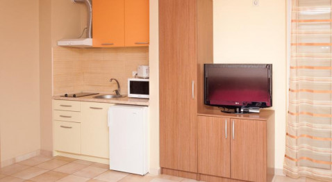 STUDIO 02: французская кровать, мини кухня, микроволновая печь, сейф, кондиционер, спутникове ТВ, Wi Fi интернет, санузел с душевой кабиной, стиральная машина, утюг, фен, балкон. Максимальное размещение: 2 чел. Площадь: 25 м2.