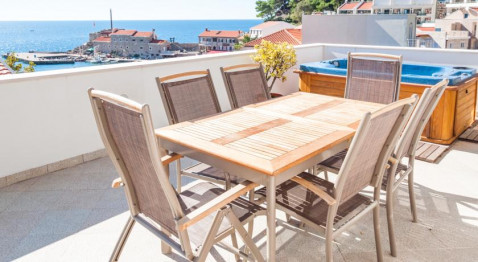 АPP Duplex 08 SV: гостиная зона на первом ярусе, отельная кухня со столовой зоной, гостинная комната на втором ярусе, три спальни с французскими кроватями, сейф, кондиционер, спутникове ТВ, Wi Fi интернет, два санузла с душевой кабиной, стиральная машина, утюг, фен, балкон с видом на море. Максимальное размещение: 8 чел. Площадь: 170 м2.
