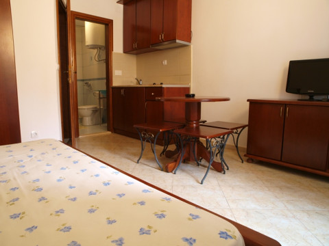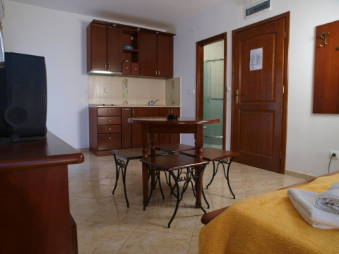 Площадью 20-25 м2 – при двухместном размещении (трехместные студии с площадью 35м2, дополнительно в номере раскладное кресло), французская кровать, кондиционер, кабельное телевидение, беспроводной интернет, мини-кухня, холодильник, ванная комната, французский балкон или терраса, вид во двор.
