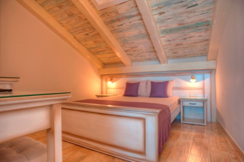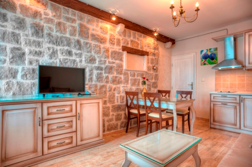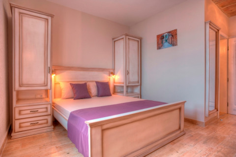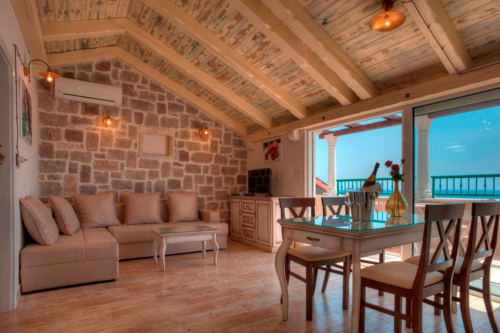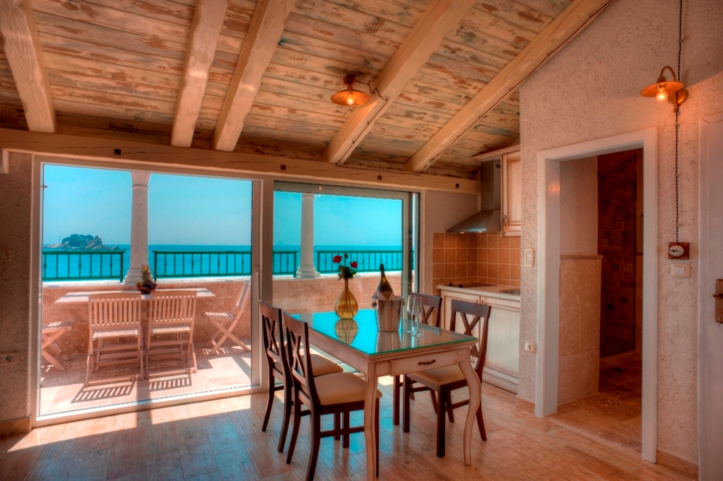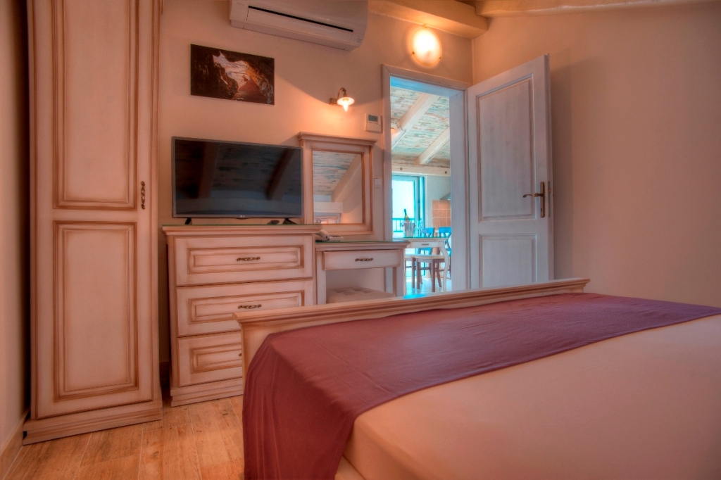 АРР 05 Delux: выполнен в деревенском стиле, гостиная с полностью оборудованной кухней, раскладывающийся диван, две спальни, каждая из которых с французской кроватью, кондиционер в каждой комнате, кабельное телевидение, телевизоры и в гостиной и в каждой спальне, Wi Fi интернет, два санузла душевой кабиной, балкон с великолепным фронтальным видом на море. Площадь апартамента: 60м2. Максимальное размещение – 5 человек.