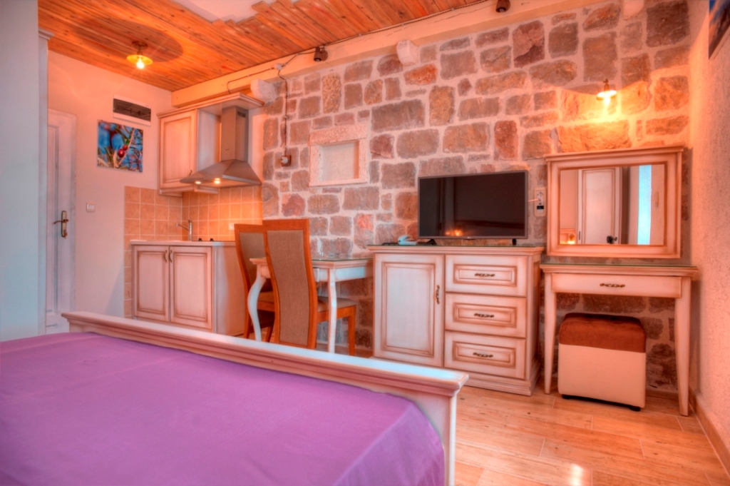 Stud 02 Delux: однокомнатный номер-студио, гостиная с полностью оборудованной кухней, французская кровать. Кондиционер, кабельное телевидение, телевизор, Wi Fi интернет, ванная комната с душевой кабиной, великолепный фронтальный вид на море, без балкона. Площадь студии: 20 м2. Максимальное размещение – 2 человека.