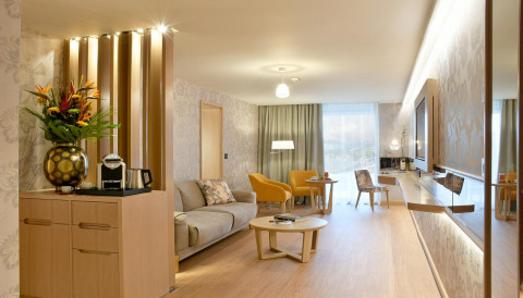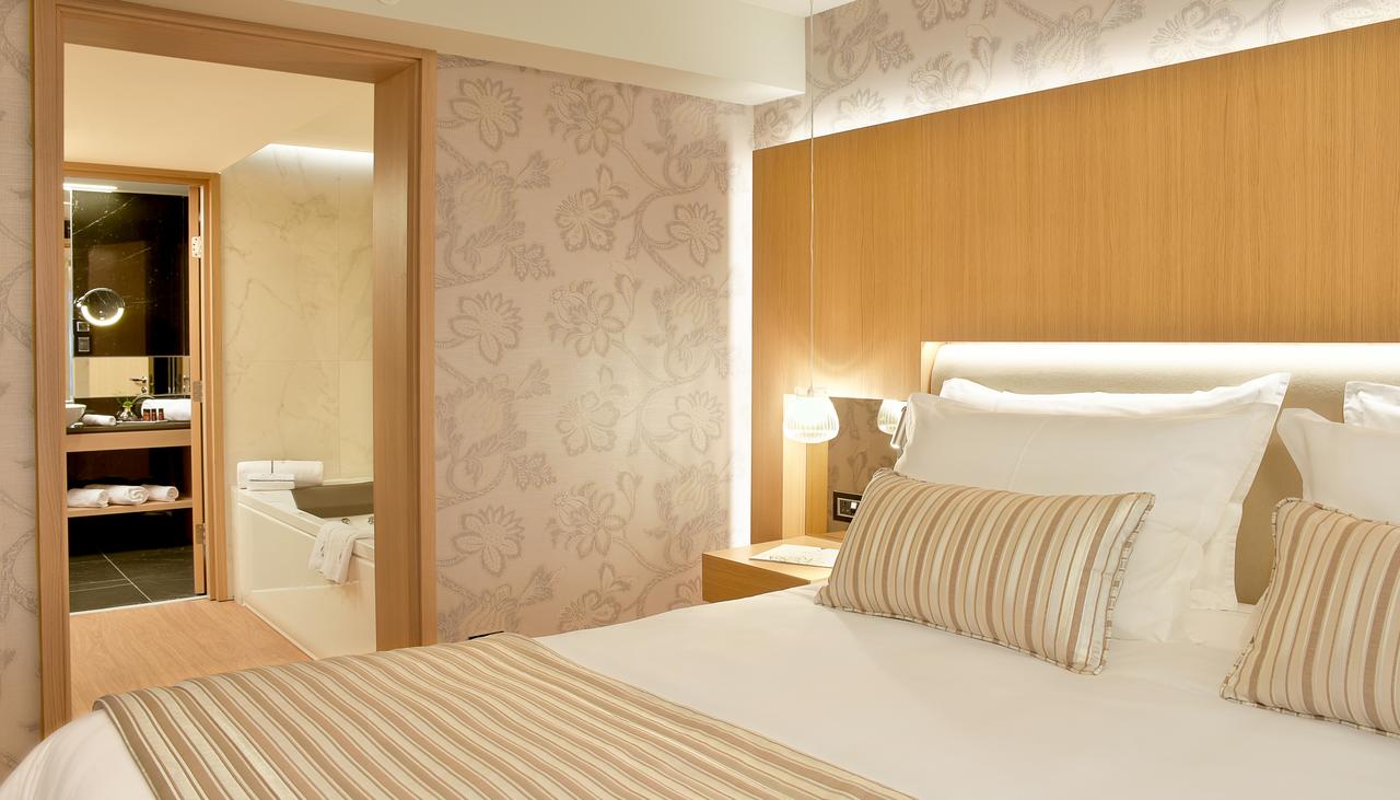 В SUITE DELUXE: гостиная и спальня, или большая французская кровать или две раздельные, кондиционер, спутниковое ТВ, прямая телефонная линия, Wi Fi интернет, два cанузла, с душевой кабиной и джакуззи, фен, халаты, тапочки, мини-бар, кофе машина, сейф, балкон с видом на море. Площадь: 80 м2. Максимальное размещение: 2 человека.