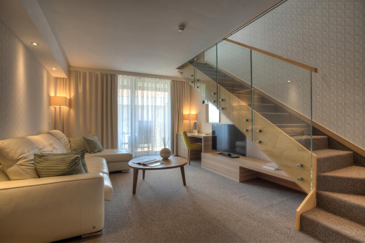 В SUITE DUPLEX PREMIUM: двухуровневый номер, на нижнем уровне гостиная, на верхнем две спальни с большими французскими кроватями, кондиционер, спутниковое ТВ, прямая телефонная линия, Wi Fi интернет, два cанузла на верхнеи и нижнем уровне, с душевой кабиной и джакуззи, фен, халаты, тапочки, мини-бар, кофе машина, сейф, балкон с видом на море. Площадь: 118 м2. Максимальное размещение: 4 человека.