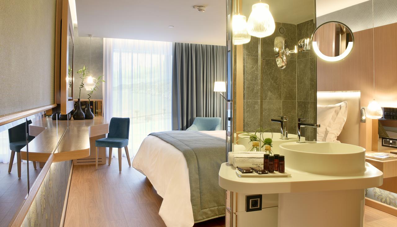 В SUPERIOR SV: большая французская кровать, кондиционер, спутниковое ТВ, прямая телефонная линия, Wi Fi интернет, мини бар, сейф, cанузел с душевой кабиной, фен, халаты, тапочки, балкон с видом на море. Площадь: 33 м2. Максимальное размещение: 2 взрослых+ 1 ребенок.