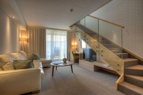 В SUITE DUPLEX: двухуровневый номер, на нижнем уровне гостиная, на верхнем спальня с большой французской кроватью, отдельный санузел, кондиционер, спутниковое ТВ, прямая телефонная линия, Wi Fi интернет, cанузел с душевой кабиной и джакуззи, фен, халаты, тапочки, мини-бар, кофе машина, сейф, балкон с видом на парк. Площадь: 80 м2. Максимальное размещение: 2 человека.