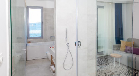 В DELUXE DBL SV: однокомнатный номер с французской кроватью и раскладывающейся софой, кондиционер, спутниковое телевидение, Wi Fi интернет, прямая телефонная линия, мини бар, сейф, санузел с душевой кабиной, туалетные принадлежности, фен, халаты, тапочки, балкон с видом на море. Площадь номера 32м2. Максимальное размещение 2+1 человека.