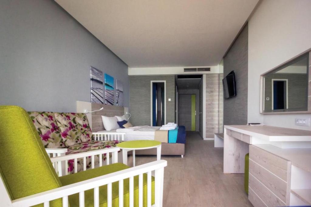 В DBL SSV: французская кровать и раскладывающаяся софа, кондиционер, спутниковое ТВ, Wi Fi интернет, мини бар, санузел с душевой кабиной, балкон без вида на море. Площадь: 25 м2. Максимальное размещение: 2 взр+ 2 реб.