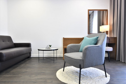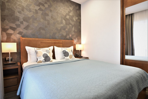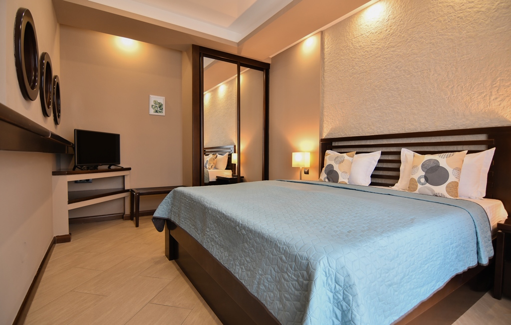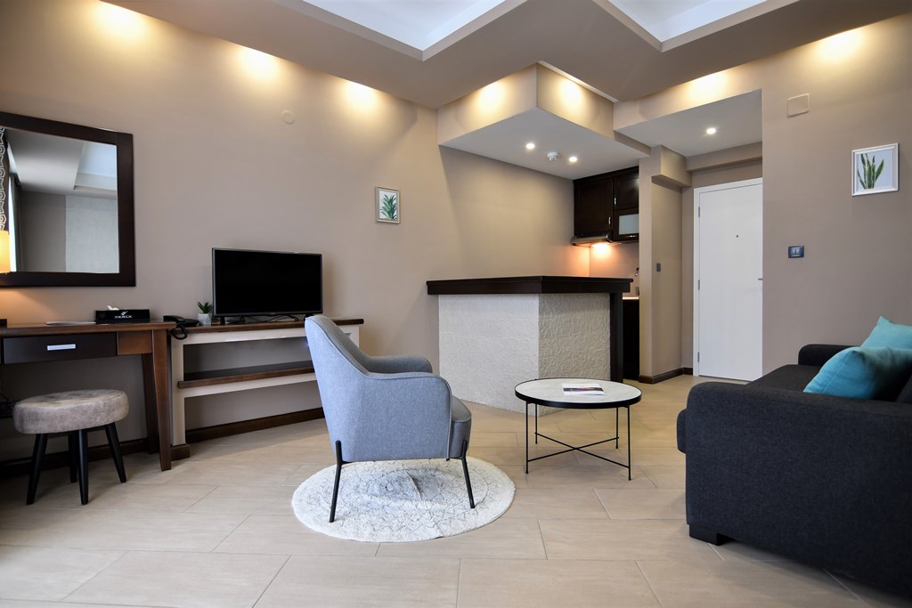 В APP: двухкомнатный номер, спальня с французской кроватью и гостинная с кухней, кондиционер, кабельное телевидение, радио, холодильник, сейф, доступ к интернету, прямая телефонная линия, две террасы с шезлонгами, ванная комната с душевой кабиной, фен, косметика, халаты, тапочки. Масимальное размещение- 3 взрослых+ 1 реб.