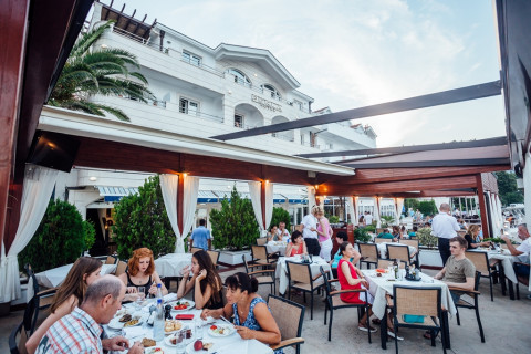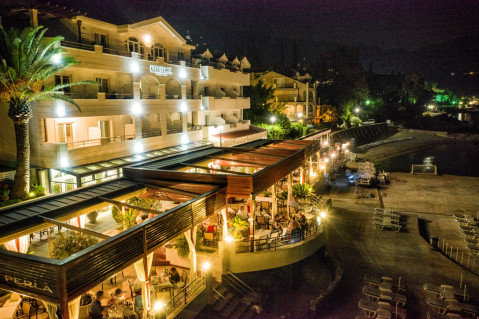 В 30 м собственный пляж (бетонная платформа), оборудован лежаками и зонтами (бесплатно). На набережной предлагают водные виды спорта (за доплату).