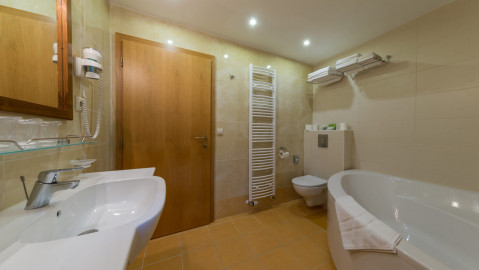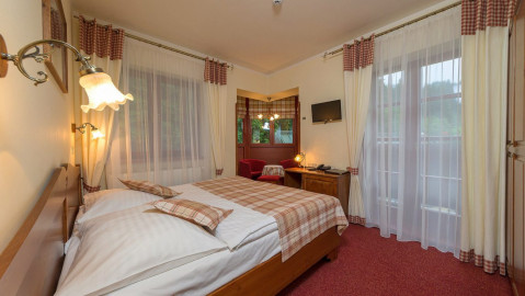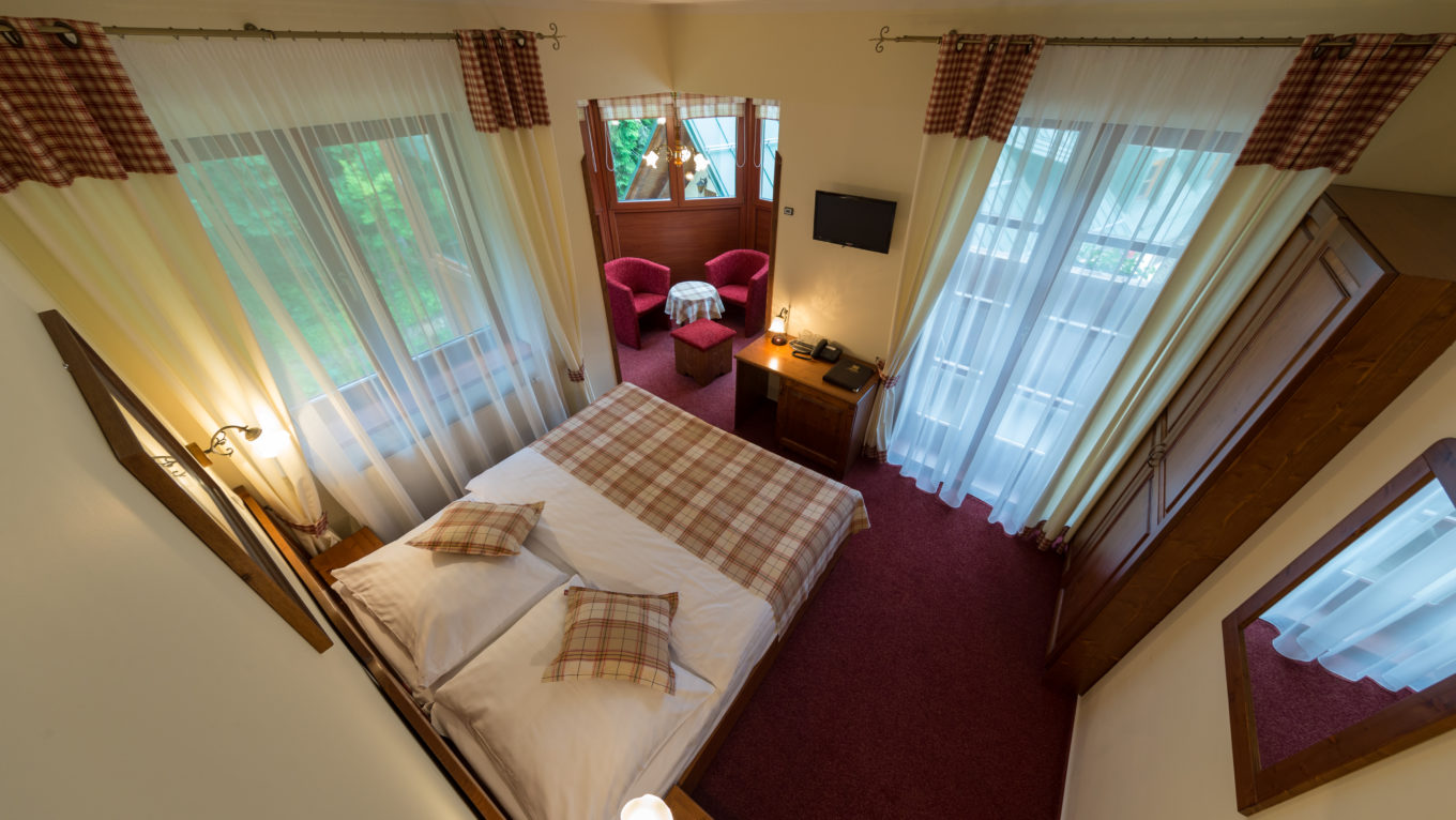 Номер COMFORT. Двухместные номера с 1 дополнительным местом. В номерах: ванная комната, туалет, фен, телефон, мини-бар, сейф, Wi-Fi, халаты. Номера оборудованы стильной деревянной мебелью.
