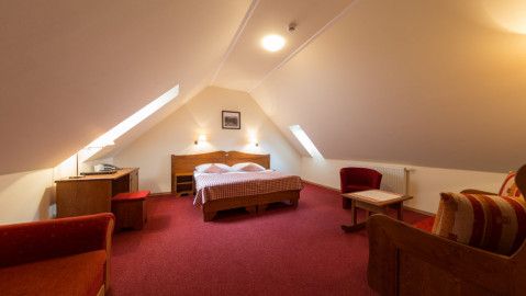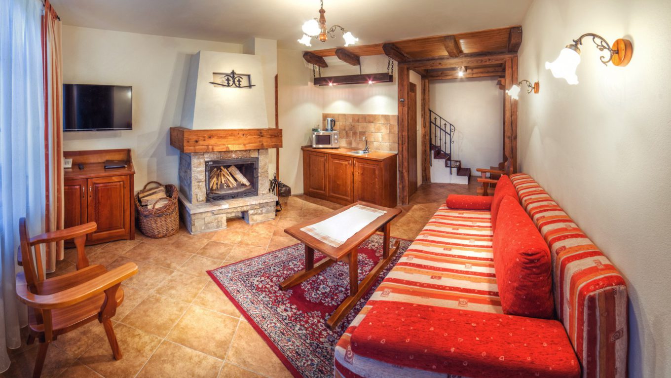 Номер APP LUX (2+2). Двухэтажные апартаменты LUX с одной спальней расположены в отдельно стоящем здании, примерно в 50 м от главного корпуса отеля. В апартаменте одна спальня, гостиная, ванная комната, туалет. Есть также кухонный уголок и камин. Раскладной диван в гостиной превращается в два дополнительных спальных места. В комнатах стильная деревянная мебель, телефон, минибар, сейф, wifi, фен, махровые халаты.