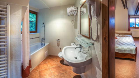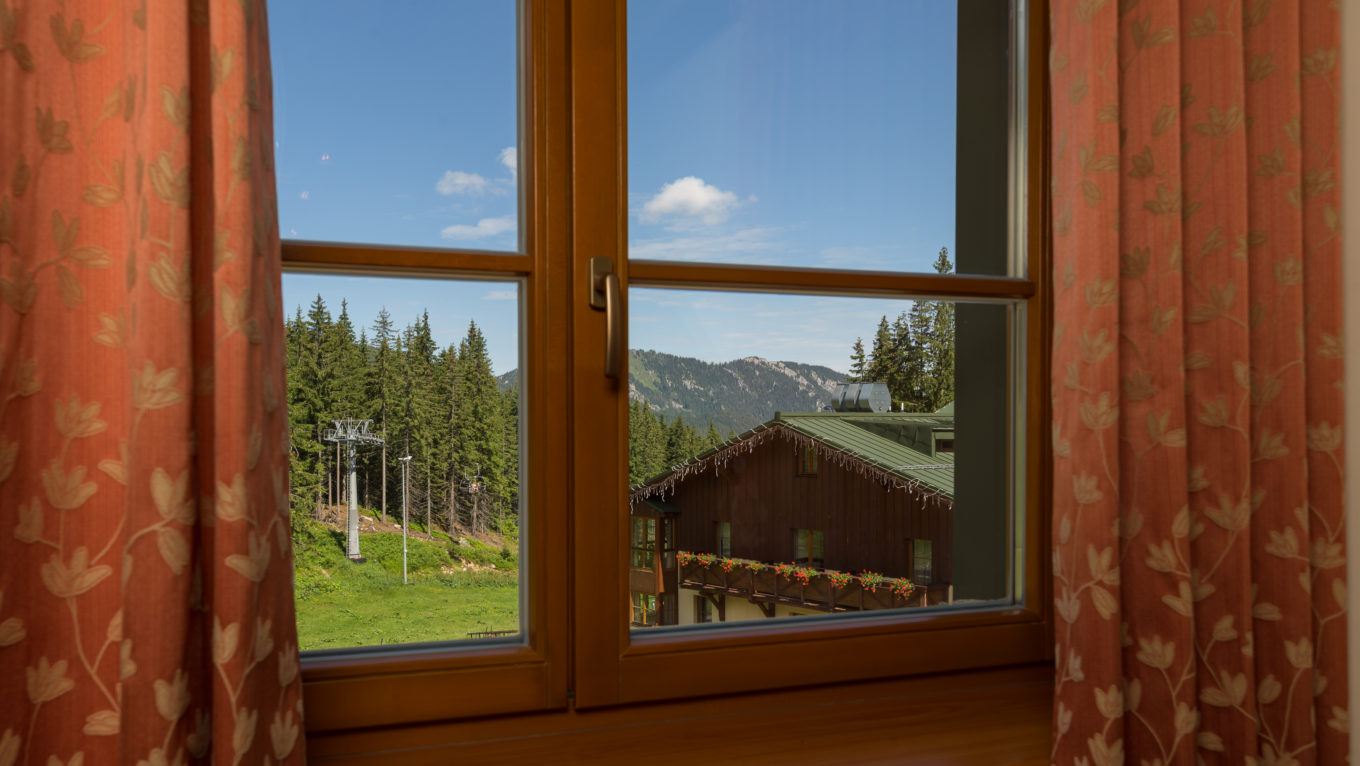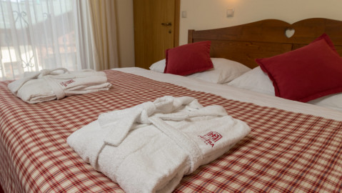 Номер COMFORT PLUS. Двухместные номера с 1 дополнительным местом. В номерах: ванная комната, туалет, фен, телефон, мини-бар, сейф, Wi-Fi, халаты. Номера оборудованы стильной деревянной мебелью. Некоторые номера с балконом или видом на лыжную трассу Белый Путь.