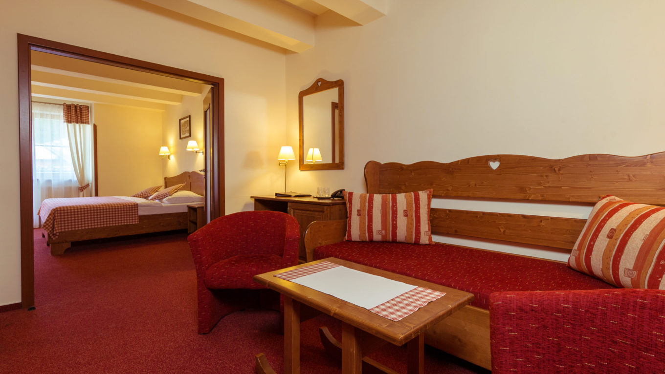 Номер FAMILY ROOM. Двухкомнатные номера – спальня с двуспальной кроватью и гостиная. В гостиной одно или два дополнительных места. В номерах: ванная комната, туалет, фен, телефон, мини-бар, сейф, Wi-Fi, халаты.