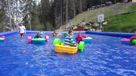Для этого построена детская площадка с цветными деревянными лестницами и «лазалками», горками, скалолазной стеной и трамплином.