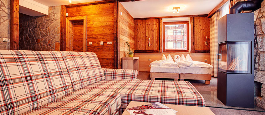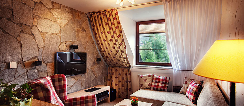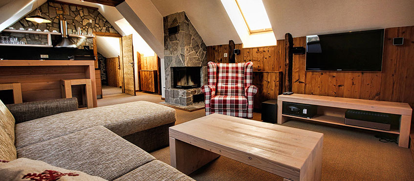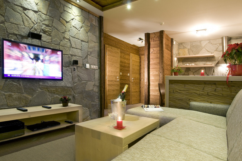 Апартаменты с каменными стенами оформлены в горном стиле, обставлены деревянной мебелью и располагают гостиным уголком и спальнями, где установлен телевизор с плоским экраном.
