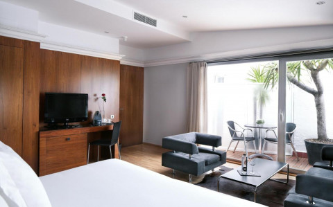 Superior (20 м2, макс. 1+1/2+0 чел.) в номерах двуспальная кровать или twin, диван, ванная комната с ванной, вид на тихий типичный внутренний двор Барселоны;