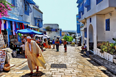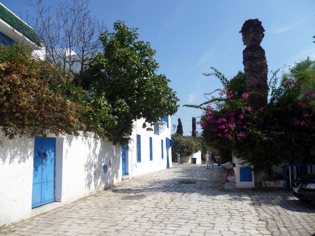Прекрасный Сиди-бу-Саид – красивейшая достопримечательность Туниса, городок в бело-голубых тонах, стоящий на скале, у подножья которой расстилается Средиземное море, вдали виднеются Атласовы горы и древний Карфаген. Городок необычен тем, что все его сооружения окрашены белый цвет, а окна, ограждения и решётки — в небесно-голубые тона. Согласно рассказам гидов, когда-то в этом тихом живописном местечке купил дом один знатный французский барон, именно он и предложил жителям покрасить их жилища в бело-голубые цвета, чтобы те меньше накалялись под лучами яркого африканского солнца