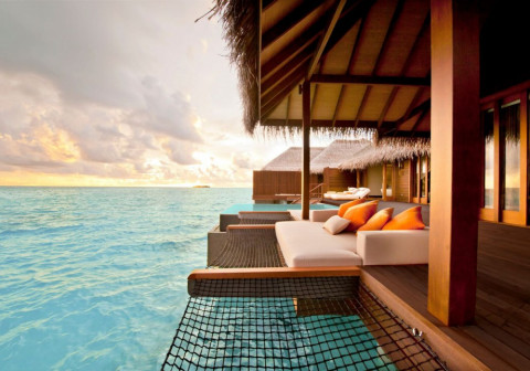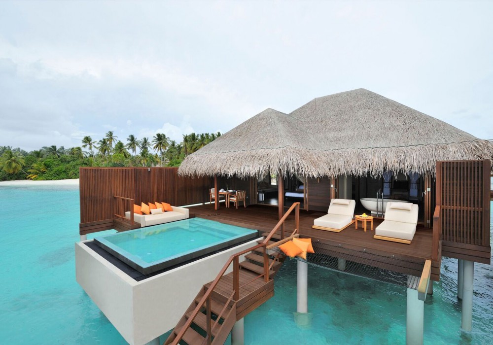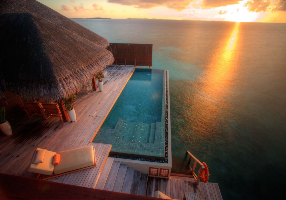 14 номерів Sunset Ocean Suite with Pool (172 кв. М, сьюти над водою включають головну спальню з індивідуальною ванною кімнатою і житловою зоною зі скляною підлогою і буфетом, величезну відкриту веранду на сонячній стороні з гамаками, прямим виходом до лагуни і видом на безкрайній горизонт )