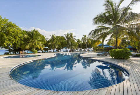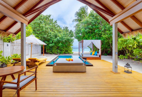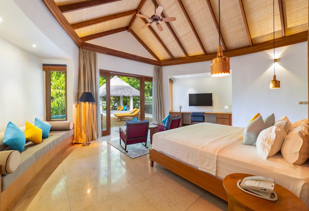 10 номерів Dhoni Pool Villa (200 кв.м, вілли на березі з приватним басейном (6 м), оформлені у вигляді традиційної Мальдівської човни "Dhoni", веранда з лежаками)