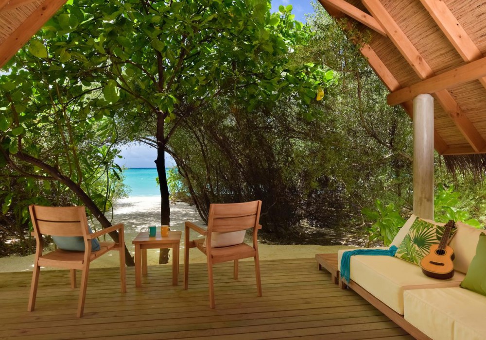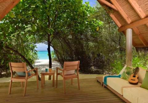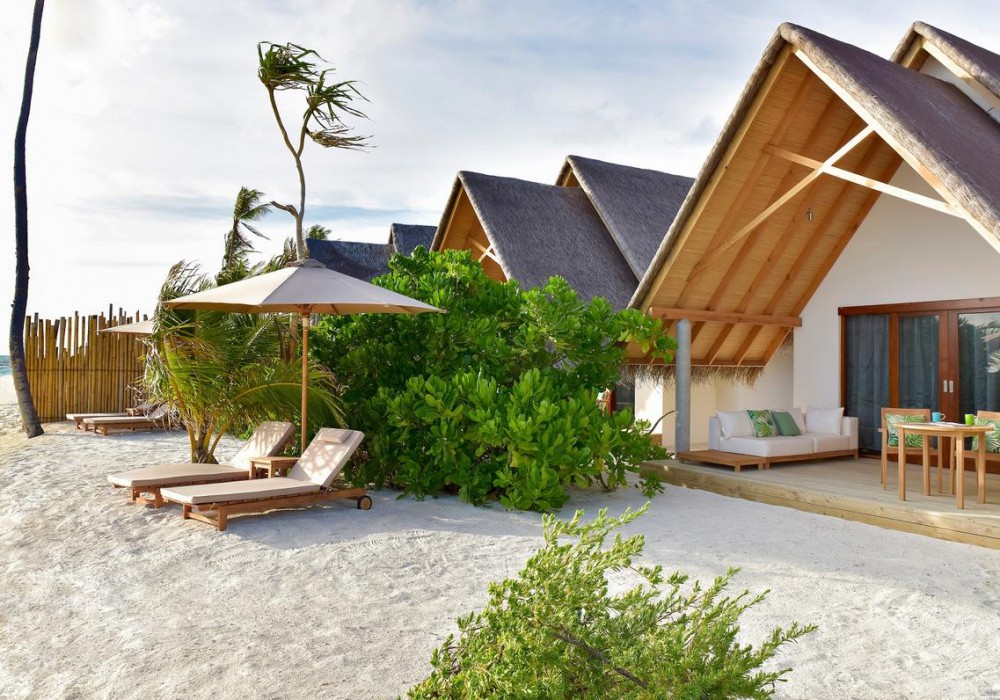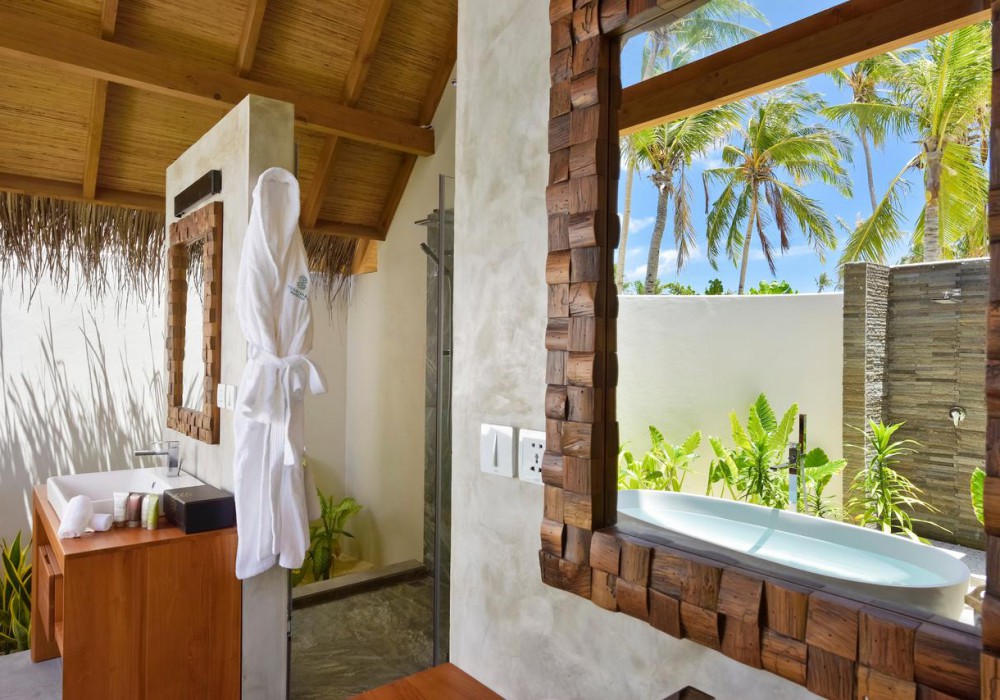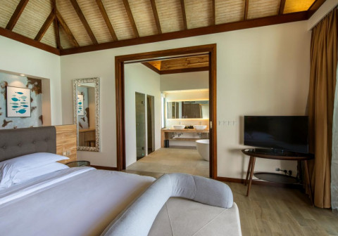 Beach Villa Sunrise (вілли на березі в східній частині острова, спальня з ліжком king-size, ванна кімната відкритого плану з ванною і душем, тераса з обідньою зоною)