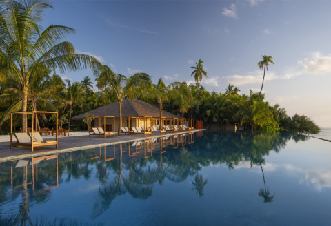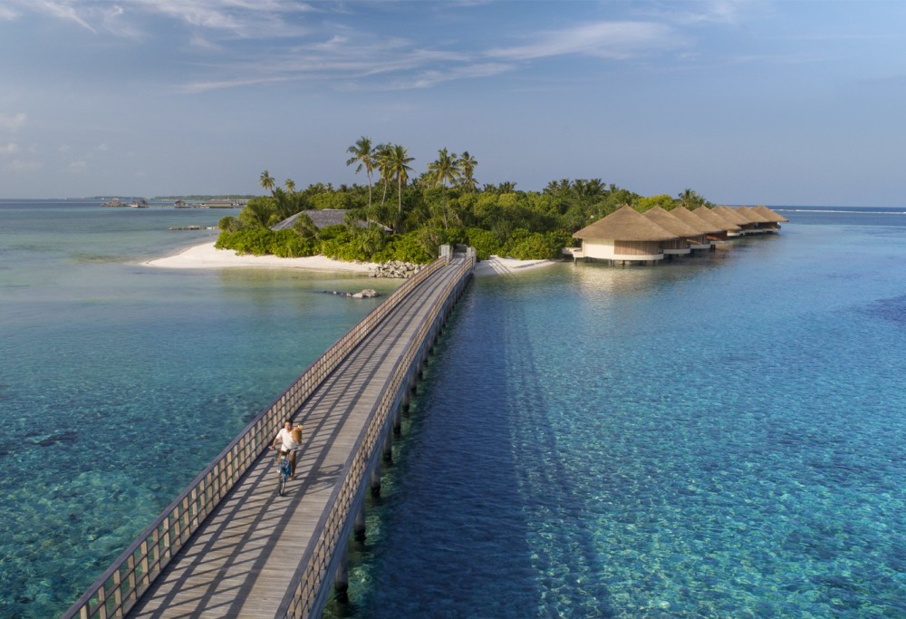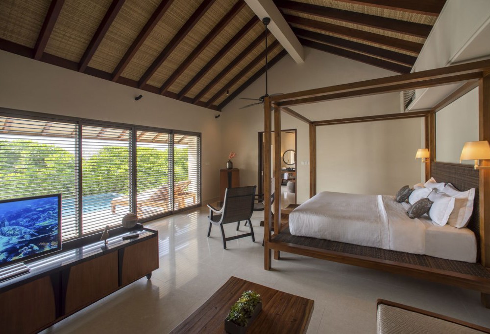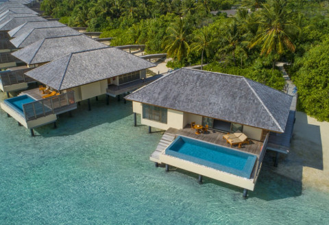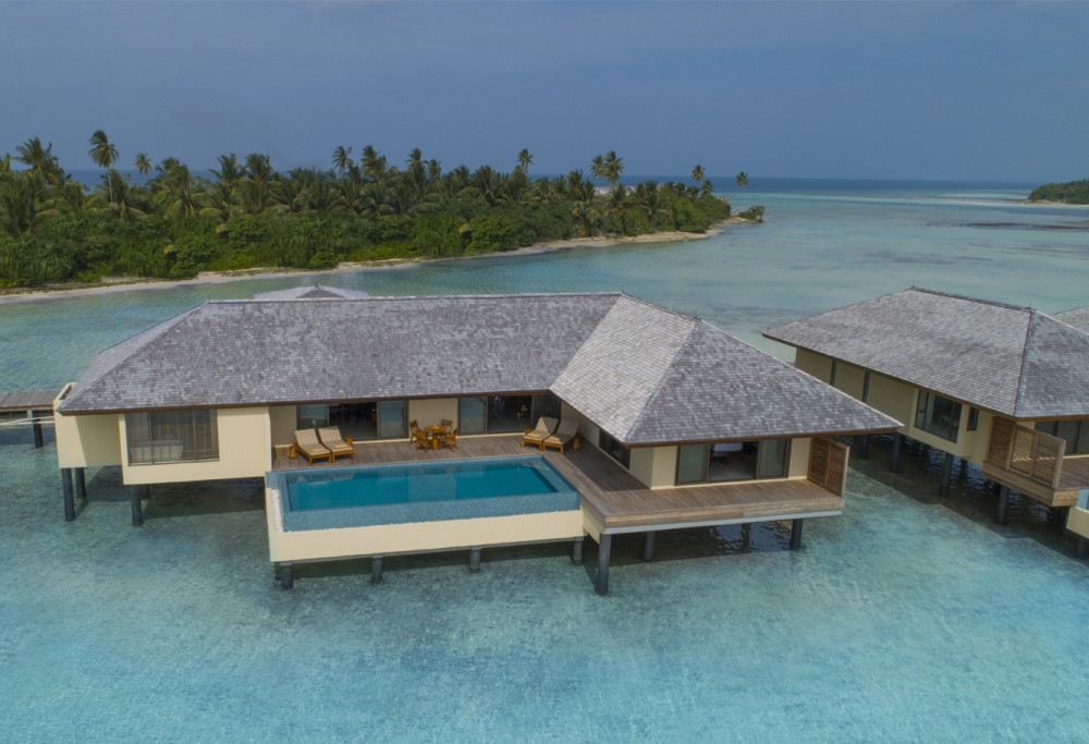4 номери Sunrise / Sunset Water Pool Villa - Two Bedroom (336 кв.м, просторі вілли на воді з двома спальнями і вітальнею, з терасою і приватним басейном, з власним спуском в лагуну)