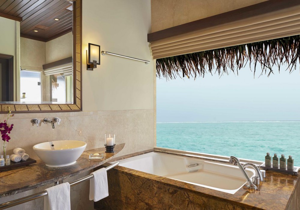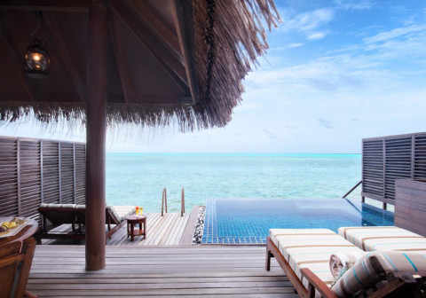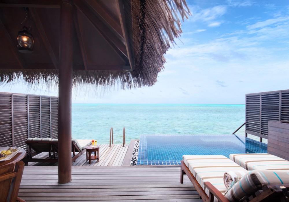 One-Bedroom Ocean Suite with Pool (195 кв. М, прекрасно облаштована вілла над водою з приватним басейном і насипним піском на платформі для прийняття сонячних ванн, скляна ванна кімната з видом на океан, подвійні раковини і тропічний душ у ванних кімнатах, приватна житлова кімната, обідня кімната)