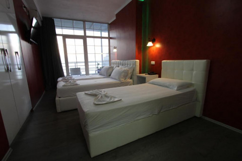 APARTMENT 2 + 1 SV, близько 85 м², великий апартамент з 2 спальнями, кухнею-вітальнею і балконом. Кухня обладнана усією необхідною технікою, є обідня зона, в вітальні зоні - диван-ліжко. В одній спальні - 1 двоспальне ліжко, в другій спальні - два односпальні ліжка. У ванній кімнаті встановлена пральна машина. Максимальне розміщення - 5-6 чоловік. Всього 5 апартаментів в готелі.
