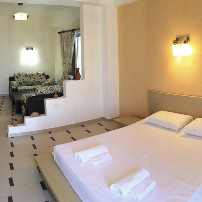 Розміщення: в готелі 18 номерів. У всіх номерах: балкон, кондиціонер, двоспальне ліжко, шафа, холодильник, телевізор, ванна кімната (фен на ресепшені, душ без душової кабіни, ванні приналежності). Прибирання номера (щодня). Зміна постільної білизни (1 раз в 2 дні).