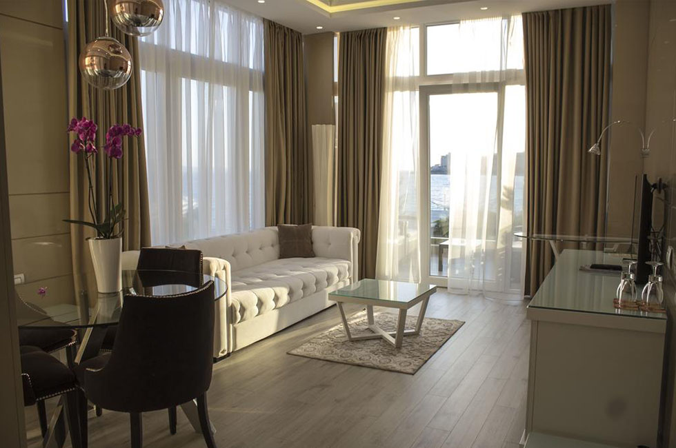 CORNER SUITE room, близько 82 м², покращений двокімнатний номер з видом на море (SV). Розділений на спальню і вітальню. У спальні - 1 двоспальне ліжко розміру King size, у вітальні - великий диван (може бути використаний, як спальне місце для 2-х чоловік). Всього 1 номер в готелі.